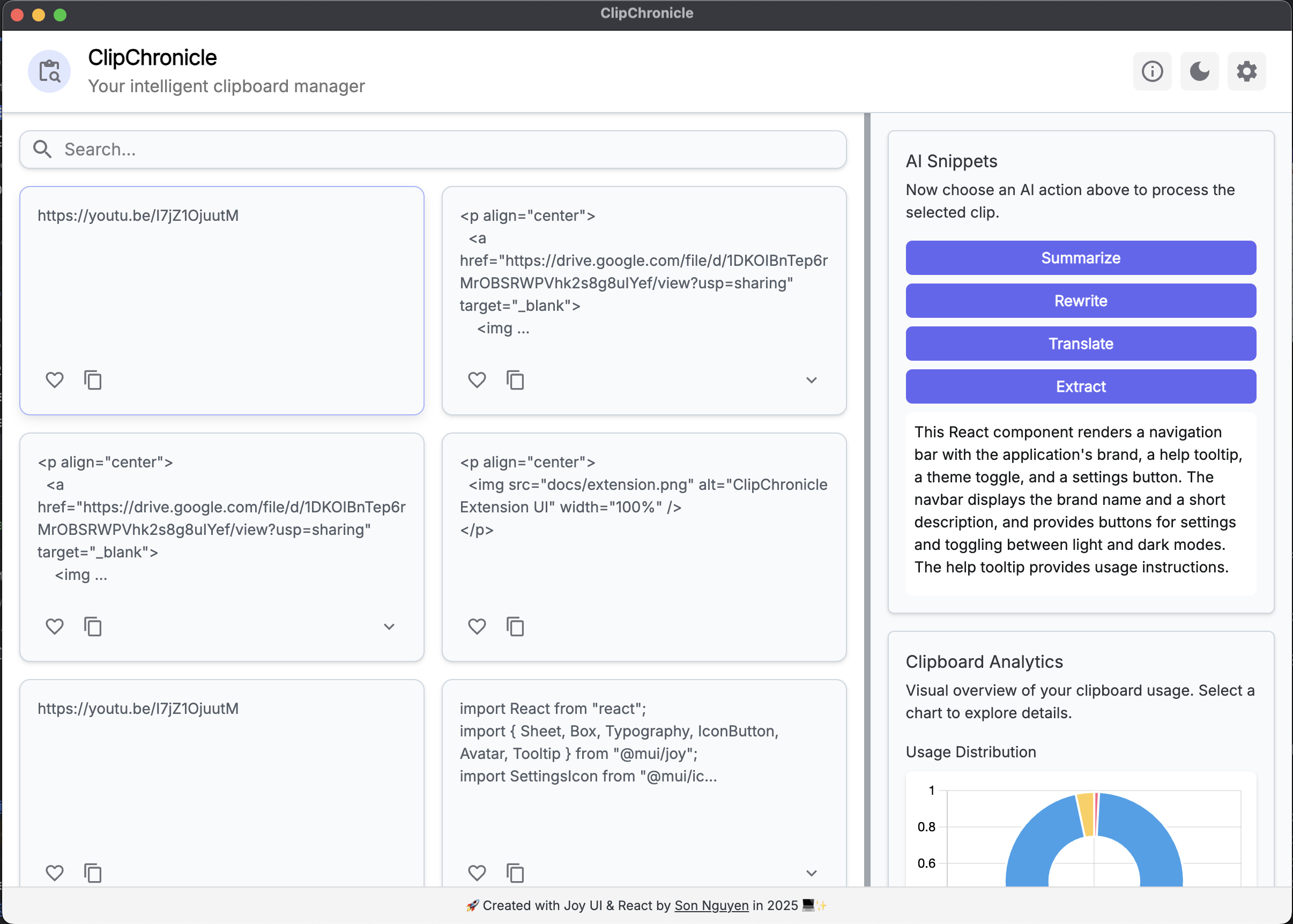 ClipChronicle runs entirely on your machine with local storage and fast indexing. You stay in control of what gets saved, when it gets cleaned, and how it gets shared.